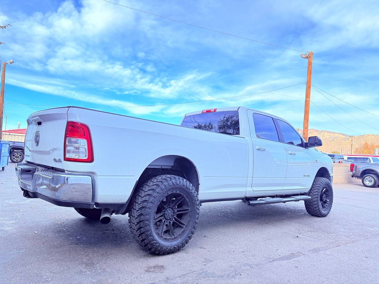 2021 Ram 2500 Big Horn Crew Cab Long Bed 4x4 - Lifted, Custom Wheels, Aggressive Tires, Six Seater The 2021 Ram 2500 Big Horn delivers heavy-duty capability, modern technology, and bold styling in a rugged, ready-for-anything package. Powered by the 6.4L HEMI V8, this 4-wheel-drive Crew Cab long bed provides strong towing and hauling performance with smooth, reliable power. This Big Horn stands tall with a professionally installed lift kit, custom wheels, and aggressive off-road tires, giving it an unmistakable presence on the road or jobsite. Inside, the desirable six-seater configuration offers excellent versatility, while the cabin features premium materials, touchscreen infotainment, Apple CarPlay, Android Auto, Bluetooth, backup camera, and convenient storage options. Durable, spacious, and outfitted for both work and play, this Ram 2500 Big Horn is built to handle it all. Available now at E&B Auto Sales, 11100 Central Ave SE, Albuquerque, NM 87123. Call 505-267-6471 to learn more or schedule a test drive. Financing available - trade-ins welcome - all credit types considered! Disclaimer: Advertised pricing does not include dealer fees or applicable taxes.We offer financing though many of our local Credit Unions and Finance Companies